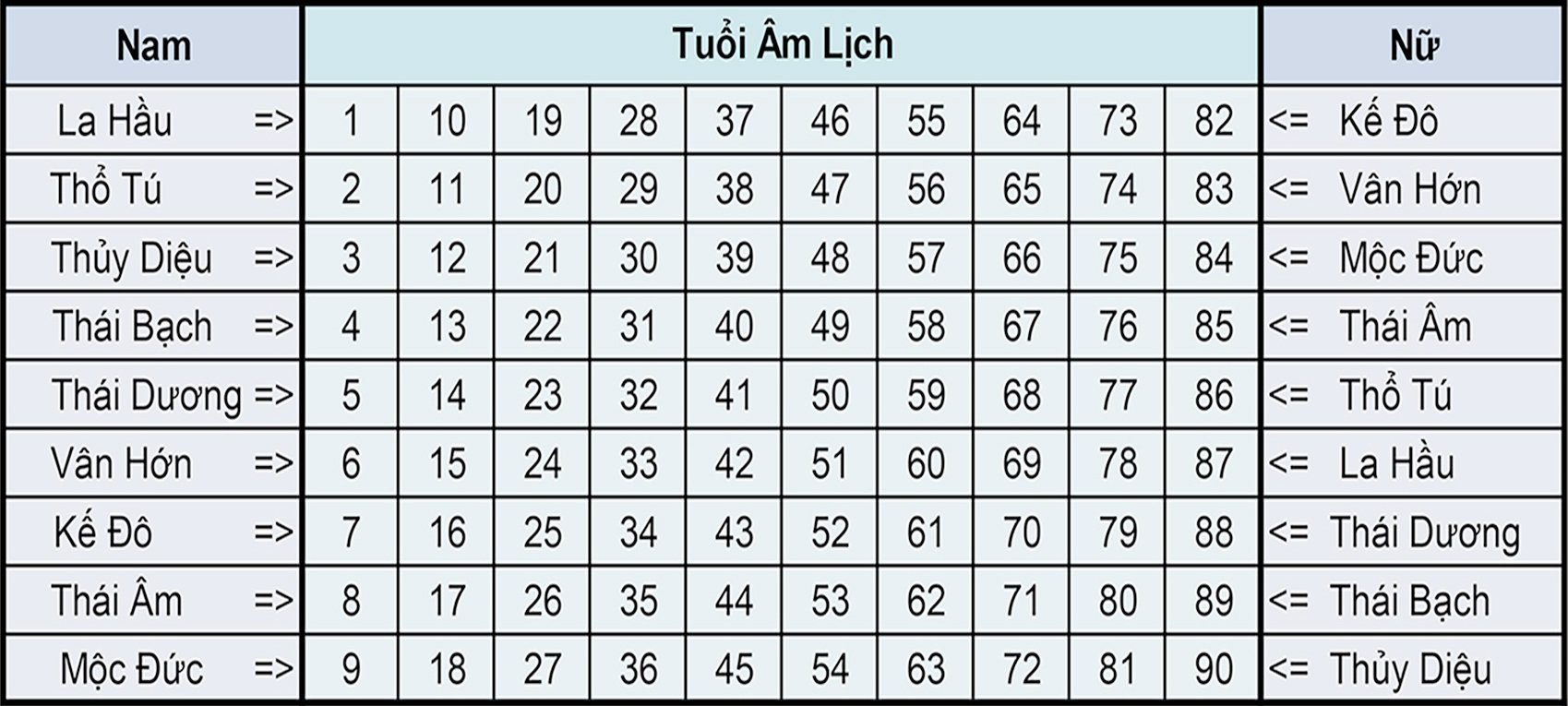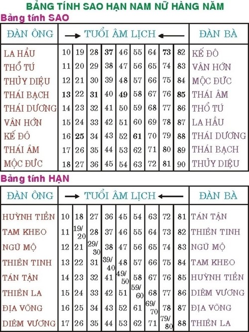 Ngoài ra, bạn cũng nên chú ý đến nửa độ tuổi có sao Diêm Vương, ví dụ, nam giới từ 17 đến 80 tuổi sẽ gặp hạn này. Đối với phái nữ, các độ tuổi như 15, 24 hay 95 cũng cần lưu ý vì có thể vướng phải hạn này. Hệ thống sao hạn rõ ràng giúp người dùng dễ dàng tra cứu và có kế hoạch cụ thể cho những điều cần tránh hoặc chuẩn bị.
