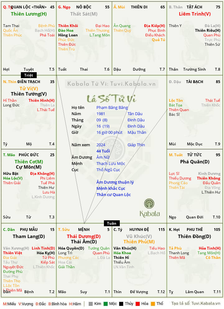 Lá số tử vi của bạn mang âm hưởng của mệnh Thạch Lựu Mộc, cho thấy một sức sống mạnh mẽ, khả năng vượt qua thử thách để gặt hái thành công. Màu sắc hợp với bản mệnh như xanh lá và đen sẽ hỗ trợ bạn trong việc tạo ra năng lượng tích cực. Đồng thời, hướng Đông cũng là hướng có lợi, giúp thu hút tài lộc và thịnh vượng.