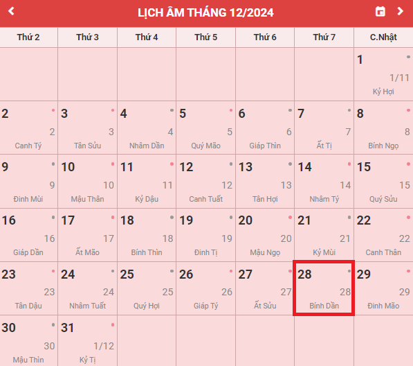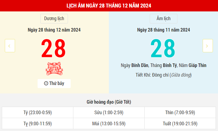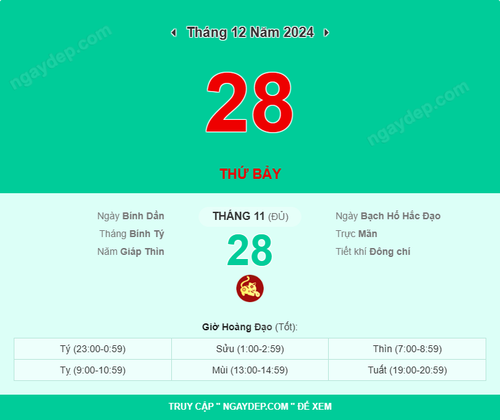 Ngày 28 tháng 12 năm 2024 dương lịch, tức là ngày 28 tháng 11 năm Giáp Thìn âm lịch, rơi vào thứ Bảy. Theo lịch Vạn Niên, hôm nay là ngày Bính Dần, một ngày có nhiều thông tin thú vị để cùng khám phá. Dù là ngày cuối tháng 12, nhưng chỉ cần nhìn vào đánh giá từ lịch âm, ta thấy ngày này được coi là ngày xấu.