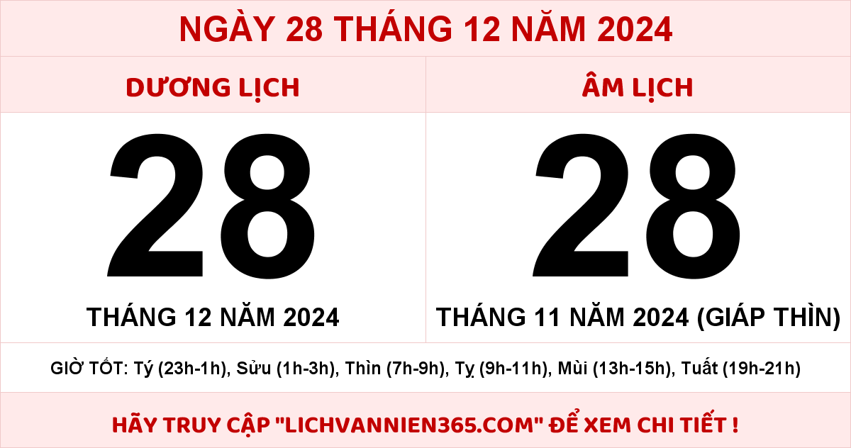 Ngày 28 tháng 12 năm 2024 đang nhận được sự quan tâm của nhiều người khi lựa chọn thời điểm quan trọng để thực hiện các công việc, sự kiện lớn như cưới hỏi, khai trương, động thổ,… Vì vậy, việc đánh giá ngày này là tốt hay xấu theo quan niệm dân gian và phong thủy trở nên rất cần thiết nhằm mang lại may mắn, thuận lợi cho bản thân và gia đình. Bài viết dưới đây sẽ cung cấp đầy đủ thông tin về ngày 28/12/2024, bao gồm ngày âm lịch, các việc nên làm, những điều nên kiêng kỵ và cách xem ngày theo lịch vạn niên một cách chi tiết và hữu ích nhất.