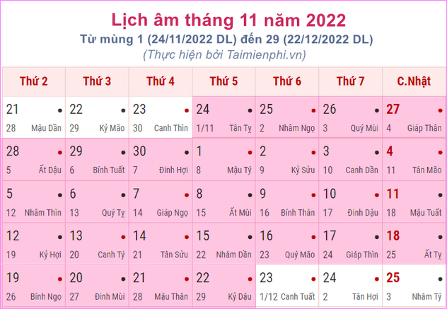 Lịch ngày đẹp tháng 11 âm lịch năm 2022