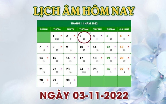 Trong tháng 11 âm lịch năm 2022, việc chọn ngày đẹp để thực hiện các công việc quan trọng rất được chú trọng. Một số ngày tốt nổi bật trong tháng này bao gồm ngày 1/11 (tức 8/10 âm lịch) và ngày 2/11. Những ngày này nằm trong khoảng thời gian thuận lợi, giúp cho mọi quyết định và hành động trở nên suôn sẻ hơn.