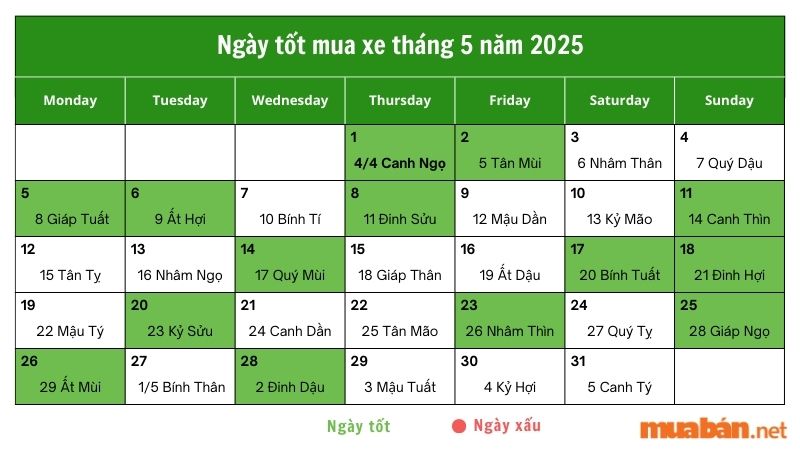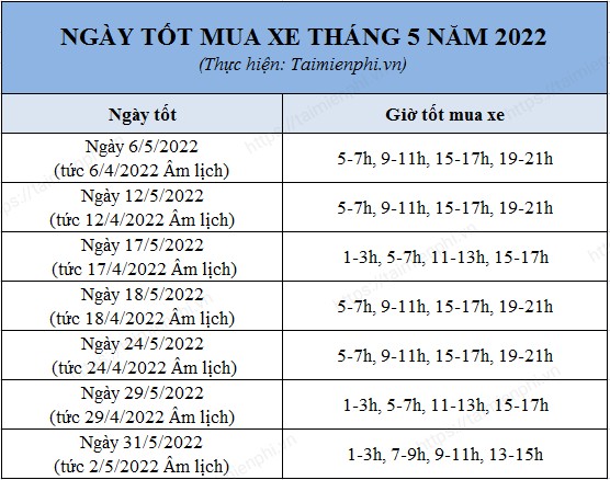 Nếu bạn đang có ý định mua xe trong tháng 5 năm 2021, việc chọn ngày tốt là rất quan trọng. Theo lịch âm, có nhiều ngày thích hợp mà bạn có thể tham khảo như Chủ Nhật, 23/05, Thứ Ba, 25/05, và Thứ Năm, 27/05. Những ngày này được cho là mang lại sức mạnh và nguồn năng lượng tích cực, giúp việc mua xe trở nên suôn sẽ hơn.