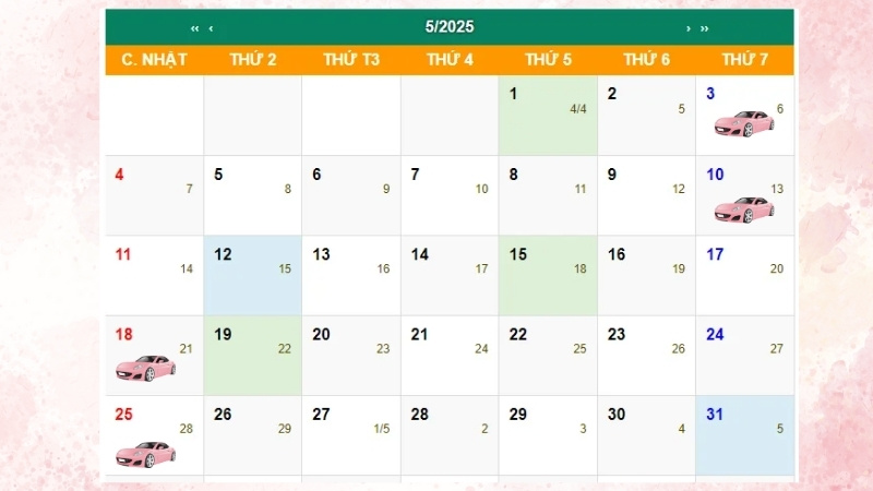 Nếu bạn đang có ý định mua xe trong tháng 5 năm 2021, hãy chú ý đến những ngày đẹp để giao dịch. Theo lịch, có một số ngày rất tốt cho việc mua xe, như Chủ Nhật, ngày 23/05 và Thứ Ba, ngày 25/05. Những ngày này không chỉ mang lại may mắn mà còn tạo điều kiện thuận lợi cho những khởi đầu mới.