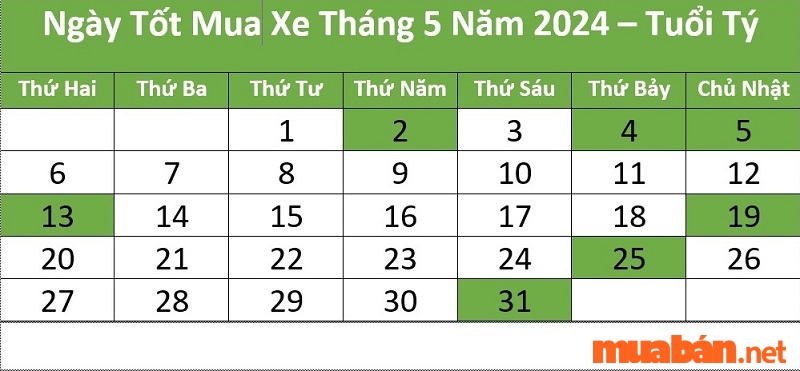 Ngoài ra, Thứ Năm, 27/05 cũng là một lựa chọn tuyệt vời, hứa hẹn mang lại năng lượng tích cực cho việc mua sắm. Cảm giác an tâm hơn khi biết các ngày này thuộc những ngày hoàng đạo, sẽ hỗ trợ giúp bạn có được chiếc xe mà mình ao ước. Ngày 31/05, Thứ Hai, cũng không nên bỏ qua, vì đây có thể là ngày khởi đầu thuận lợi cho nhiều kế hoạch trong tương lai.