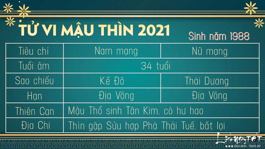 Năm 2021 đối với nữ mạng Mậu Thìn 1988 có nhiều điều kiện để phát triển, nhưng cũng không thiếu thử thách. Với sao Thái Dương chiếu mệnh, bạn có cơ hội tốt trong công danh và tài lộc. Tuy nhiên, hung tinh như Địa Võng lại mang đến những vướng mắc không mong muốn. Do đó, mọi kế hoạch làm ăn hay công việc đều cần phải được suy tính cẩn thận để tránh rủi ro.