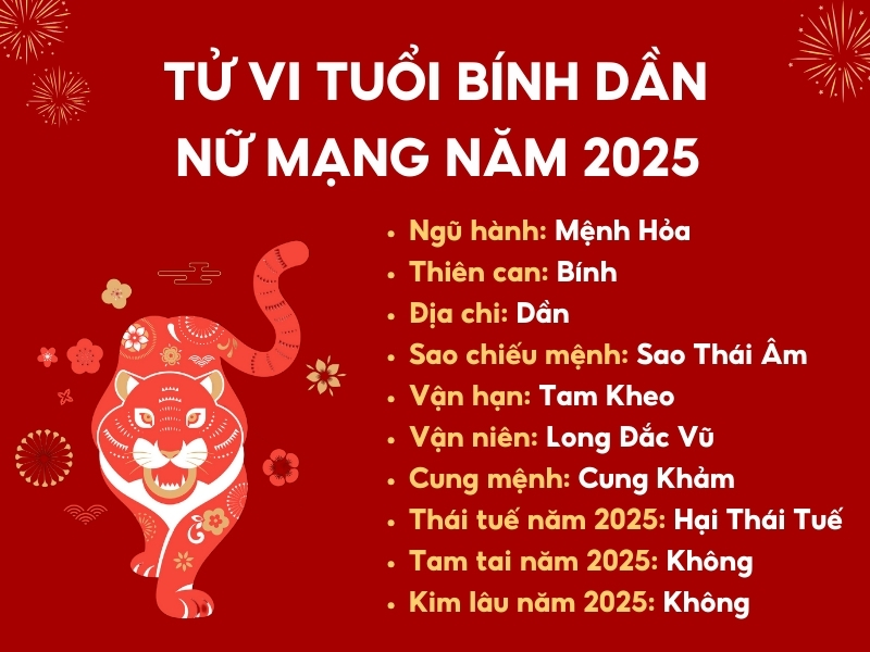 Tử vi dự báo năm 2025 sẽ mang đến nhiều cơ hội trong công việc và tài lộc cho nữ giới tuổi Bính Dần. Tuy nhiên, bên cạnh những điều tích cực đó, họ cũng cần phải chú ý đến các mối quan hệ cá nhân, bởi đây là thời điểm có thể xuất hiện các vấn đề hiểu lầm hoặc căng thẳng.