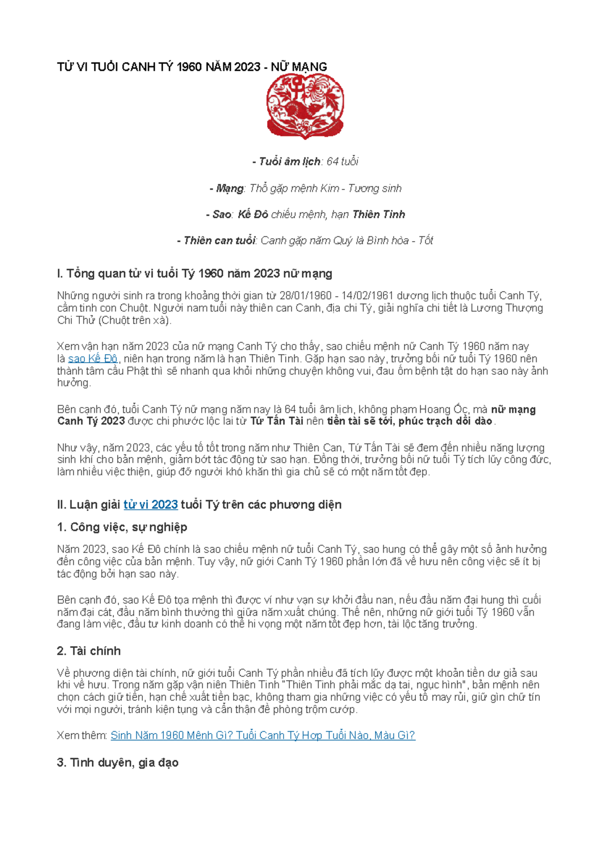 Năm 2023, những người sinh năm 1960, tuổi Canh Tý, bước vào tuổi 64 âm lịch. Đây là giai đoạn mà cuộc sống đã bắt đầu đạt được những ổn định nhất định, nhưng không thể tránh khỏi những thử thách, đặc biệt trong vấn đề tài chính. Tài vận trong năm này chưa thật sự khả quan, có nhiều yếu tố hung tinh có thể gây hao tài, vì vậy cần phải cân nhắc kỹ lưỡng trước khi đầu tư hoặc chi tiêu.