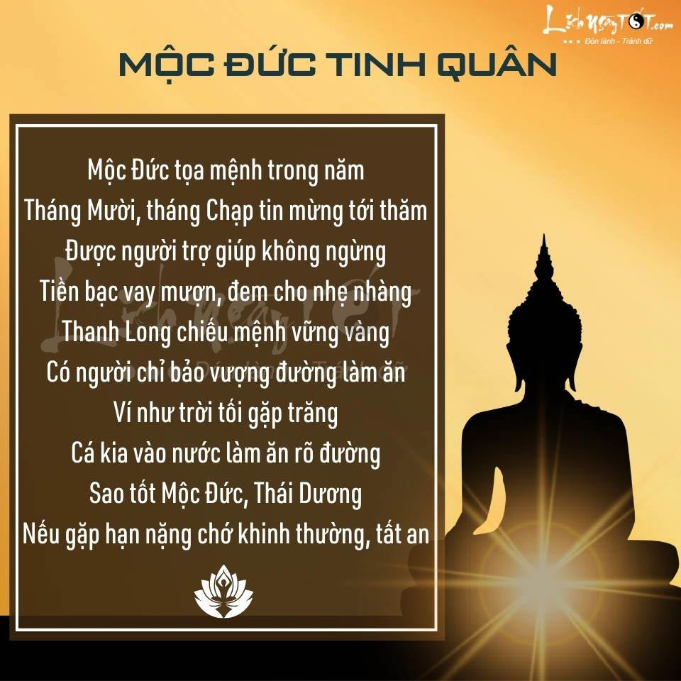 Theo truyền thống, trong năm có sao Mộc Đức, người ta tin rằng tháng 10 và tháng 12 âm lịch sẽ mang đến tin vui, đặc biệt có khả năng gặp quý nhân phù trợ về tài chính. Để thực hiện lễ cúng, chủ mệnh nên đặt bàn thờ theo hướng chính Đông, thắp 20 ngọn nến và chuẩn bị các lễ vật như hương, hoa, phẩm oản, tiền vàng cùng bài vị màu xanh.