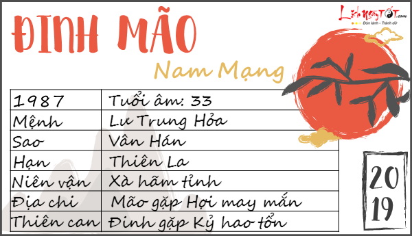 Năm 2019 là một năm nhiều biến động đối với những người tuổi Đinh Mão (1987). Với tướng tinh là Con Gà và mang mệnh Lư trung Hỏa, nam mạng Đinh Mão thường gặp phải nhiều thử thách trong công danh sự nghiệp và tài chính. Những vấn đề pháp lý, tranh chấp có thể xảy ra, đòi hỏi người tuổi này phải hết sức cẩn thận và giữ bình tĩnh.