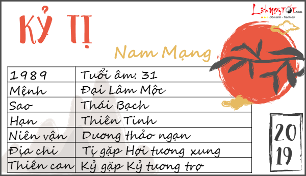 Năm 2019, tuổi Kỷ Tỵ (1989) gặp sao Thái Bạch chiếu mạng, điều này báo hiệu một năm đầy khó khăn và thử thách. Nam mạng sẽ phải đối mặt với những vấn đề bất lợi trong công việc và các mối quan hệ xã hội. Sao Thái Bạch thường mang lại hao tán tiền bạc, bệnh tật và dễ gặp tiểu nhân, nên cần thận trọng trong giao tiếp và đầu tư.