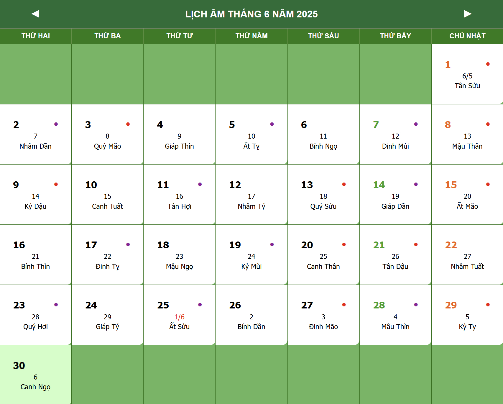 Trong tháng, có một số ngày hoàng đạo mà bạn có thể tham khảo. Ví dụ, ngày 28 tháng 6 âm lịch (khoảng 26 tháng 5 âm lịch) là một trong những ngày được khuyên dành cho các việc cúng bái. Ngoài ra, tháng này còn đánh dấu nhiều ngày lễ khác nhau như Ngày Quốc tế Thiếu nhi hay Ngày Môi trường Thế giới.
