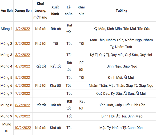 Năm 2022, những ngày đầu năm được xem là thời gian tốt đẹp để thực hiện những hoạt động quan trọng như khai bút, du xuân hay lễ chùa. Trong số đó, các ngày mùng 1, mùng 2, mùng 6 và mùng 10 Tết nổi bật lên như những thời điểm khá tốt để khởi đầu. Vào những ngày này, mọi người thường tranh thủ để cầu mong sức khỏe và tài lộc cho cả năm.