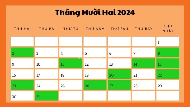 Tháng này, các ngày có thể tổ chức lễ cưới được khuyến nghị bao gồm ngày 1, 2, 6, 8, và nhiều ngày khác. Những ngày này đều mang lại may mắn, tài lộc, giúp các cặp đôi khởi đầu một hành trình mới đầy hạnh phúc. Ngoài ra, tháng 12 còn ghi nhận nhiều ngày lễ quan trọng như Ngày thế giới phòng chống AIDS 1/12 hay Ngày Giáng sinh 24/12, cũng mang đến nhiều hoạt động ý nghĩa.