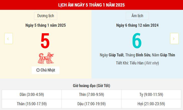 Đặc biệt, ngày 6/1 được xem là Ngày Hảo Thương, với nhiều điều tốt lành. Trong ngày này, các công việc thường xuyên diễn ra thuận lợi, và bạn có thể gặp được quý nhân giúp đỡ, tạo cảm giác an tâm khi thực hiện kế hoạch. Để nắm bắt cơ hội này, việc xem lịch âm và lịch vạn niên giúp xác định giờ tốt trong ngày cũng rất quan trọng.