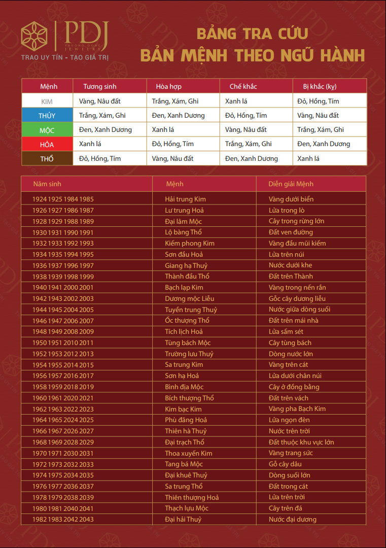 Mỗi người sẽ tương ứng với một trong năm yếu tố ngũ hành: Thủy, Hỏa, Thổ, Kim, Mộc, và điều này sẽ ảnh hưởng đến vận mệnh của họ. Qua việc xác định Can và Chi từ năm sinh, ta có thể biết mình thuộc mệnh gì, từ đó đưa ra những lựa chọn tốt nhất cho cuộc sống.