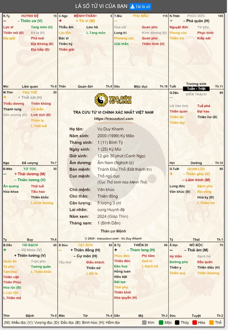 Xem tử vi theo ngày tháng năm sinh là một phương pháp truyền thống giúp bạn có cái nhìn tổng quan về vận mệnh của mình. Với bảng tra cứu tử vi trọn đời theo từng tuổi Lục thập hoa giáp, bạn có thể luận đoán về nhiều mặt trong cuộc sống như tài lộc, sự nghiệp, tình duyên và gia đạo. Mỗi lá số sẽ cung cấp thông tin chi tiết về công danh, sức khỏe, tài chính và mối quan hệ xã hội của bạn.