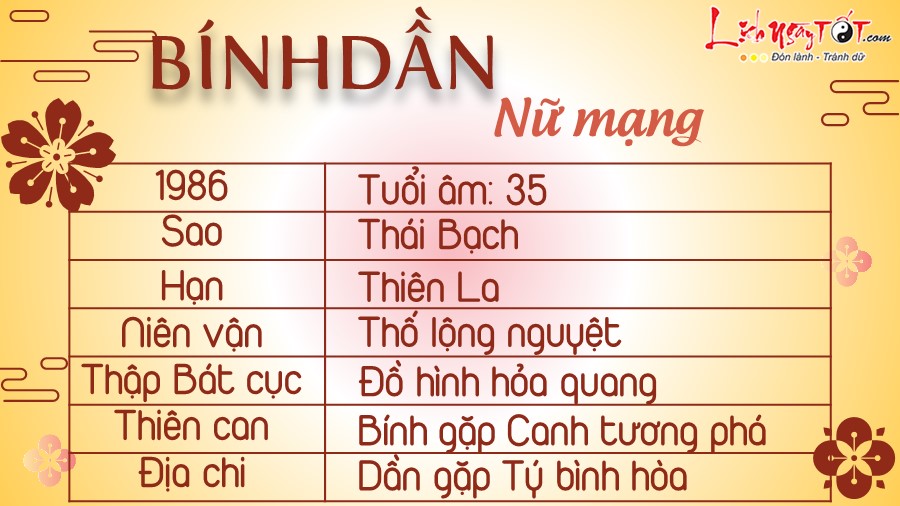 Năm 2020, nữ mạng tuổi Bính Dần (1986) gặp sao Thái Bạch chiếu mạng, một sao được xem là không mấy thuận lợi. Đầu năm, bạn nên cầu an, dâng sớ giải hạn vào ngày rằm 15 âm lịch mỗi tháng để hóa giải những điều không tốt. Mặc dù năm nay có cơ hội kinh doanh, buôn bán, nhưng sẽ gặp nhiều khó khăn và vất vả trong công việc.