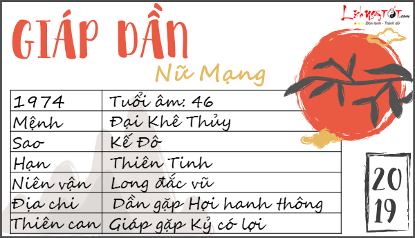 Năm 2019 mang đến nhiều thách thức cho nữ mạng Giáp Dần, được sinh ra từ 23-1-1974 đến 10-2-1975. Sao Kế Đô chiếu mệnh, khiến cho bản thân dễ gặp phải tai tiếng, thị phi và đôi khi cảm thấy rối rắm trong công việc lẫn cuộc sống. Sự bất ổn này có thể làm ảnh hưởng đến tinh thần và tâm lý.