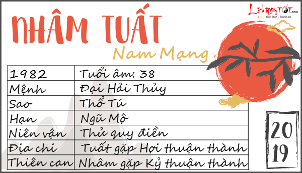 Tuổi Nhâm Tuất, sinh từ 25-1-1982 đến 13-2-1983, có mạng Đại Hải Thủy (Nước biển lớn). Trong năm 2019, họ sẽ được sao Vân Hớn chiếu mệnh. Điều này đồng nghĩa với việc sẽ có không ít rắc rối và nạn tai quanh họ. Thêm vào đó, hạn Ngũ Mộ có thể gây hao tài, ảnh hưởng đến tài chính và công việc.